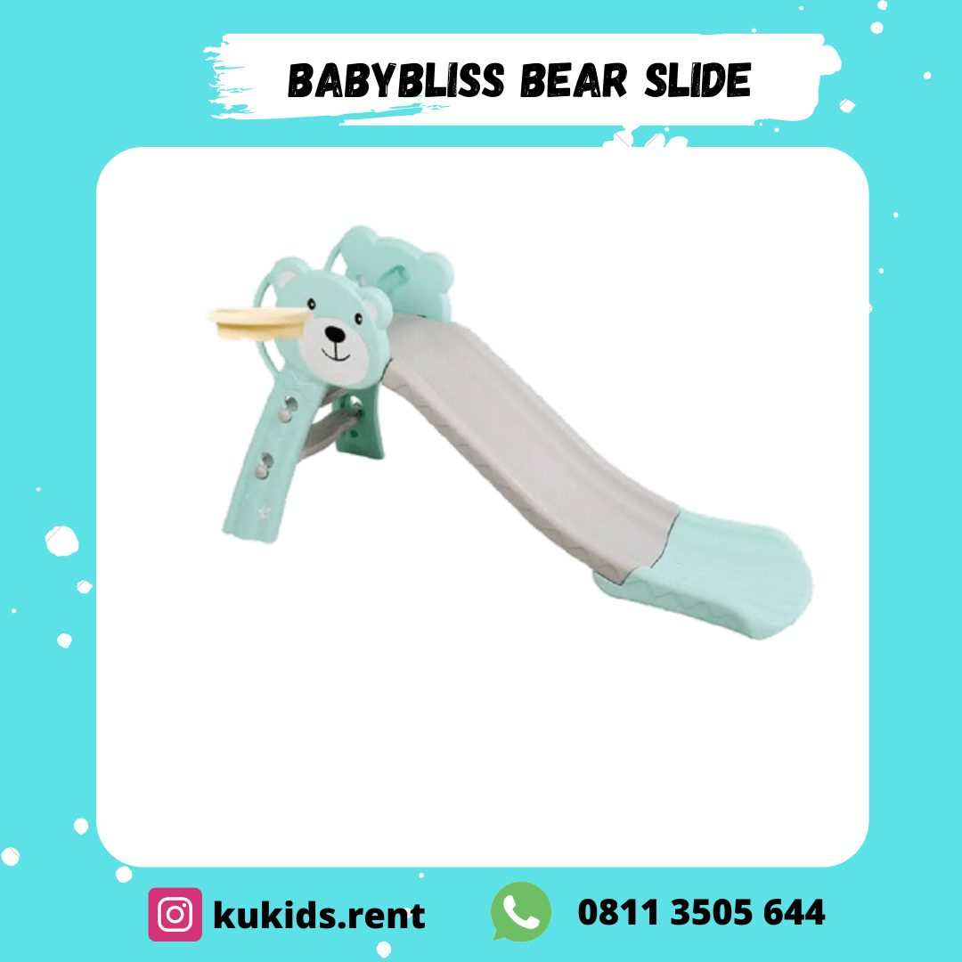 Perosotan bentuk beruang imut berwarna biru tosca, dilengkapi dengan anak tangga dan ring basket. Ukuran perosotan (Panjang 143 cm, Lebar 41 cm, Tinggi 81 cm). Bisa dilipat sehingga mudah dibawa-bawa dan dimasukan ke mobil. Terbuat dari bahan yang kuat dan aman bagi anak-anak (BPA Free). Terdapat fitur tambahan flat plate yang berfungsi mencegah anak tidak langsung membentur lantai saat main perosotan. Direkomendasikan untuk anak - anak di rentang usia 1-2 tahun.