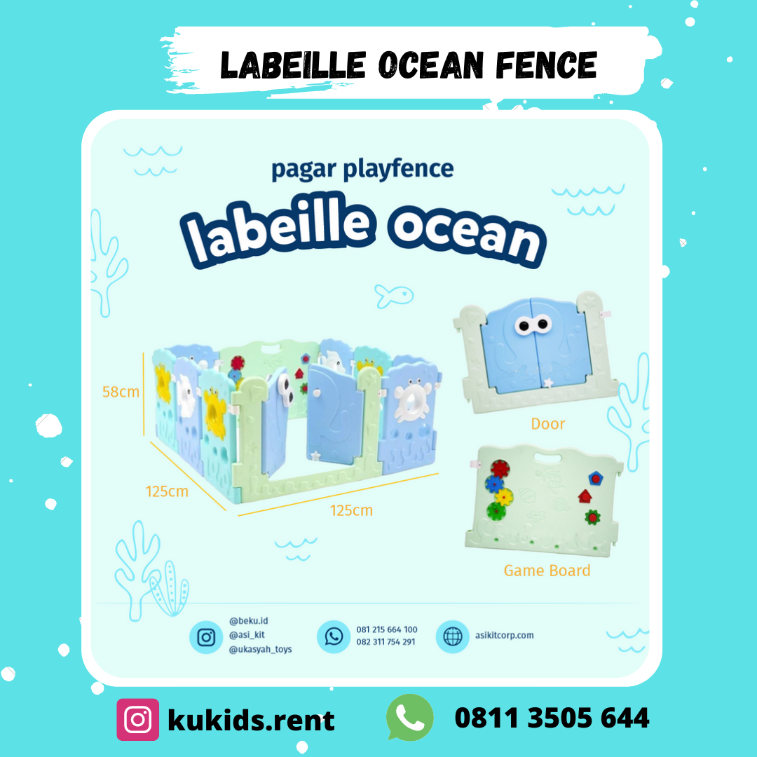 L’abeille KC215 Ocean Fence Pagar Pengaman Anak, pagar pengaman bayi berbahan plastik berkualitas yang mudah dipasang & dibersihkan, dan dapat diperluas. Terdapat 4 panel karakter ikan, 4 panel karakter kepiting, 1 panel pintu pengaman dan 1 panel activity board papan aktivitas. Pagar ini dilengkapi dengan kop karet yang dapat digunakan pada permukaan licin serta dapat dimainkan di dalam maupun luar ruangan.